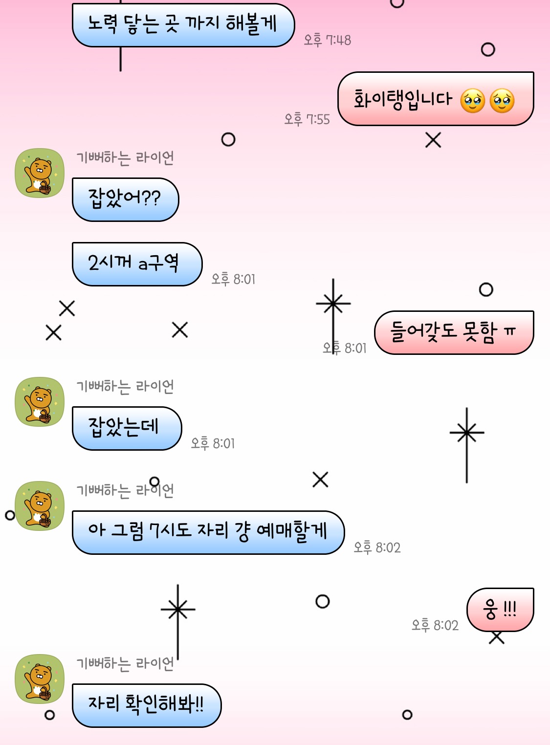 티켓팅 당일은 학원에 있었기 때문에 (🥲) 짱친구가 아주 멋진 자리를 예매해줬다. 정말 고마버 … 난 사이트 들어가지도 못하고 화장실에 쭈구려서 어헝 거리고 있었는데 티켓 예매 알람이 연달아 올 때의 그 안도감💧 짱임 짱친구임.